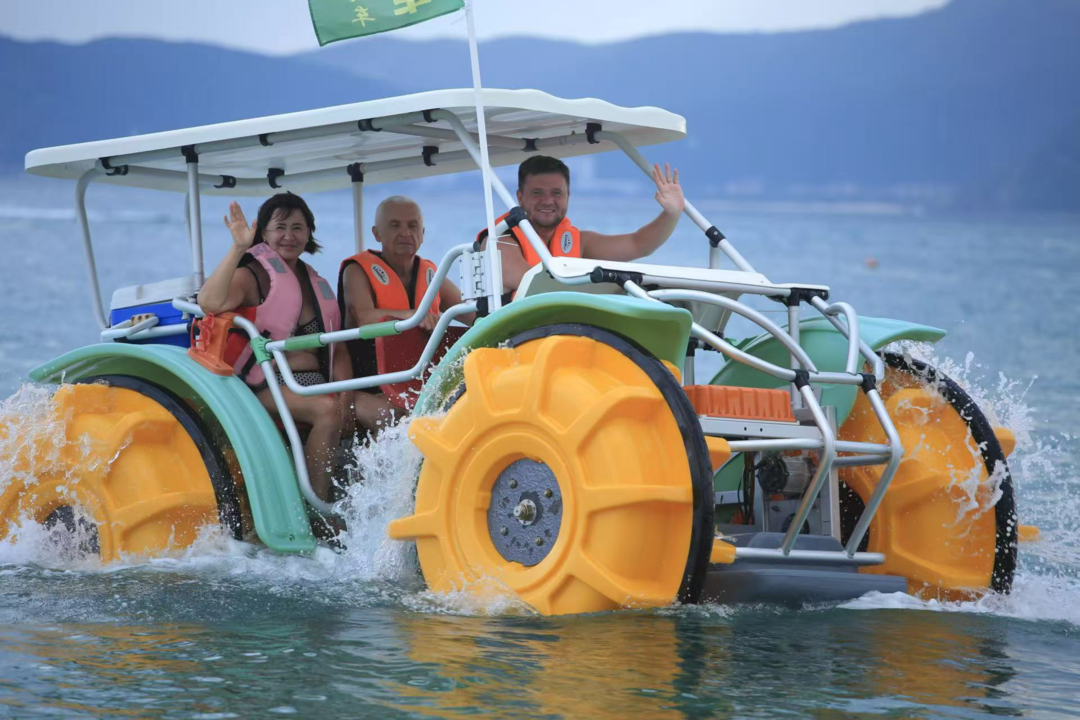 俄罗斯游客在三亚海边体验水上脚踏车。图据受访者